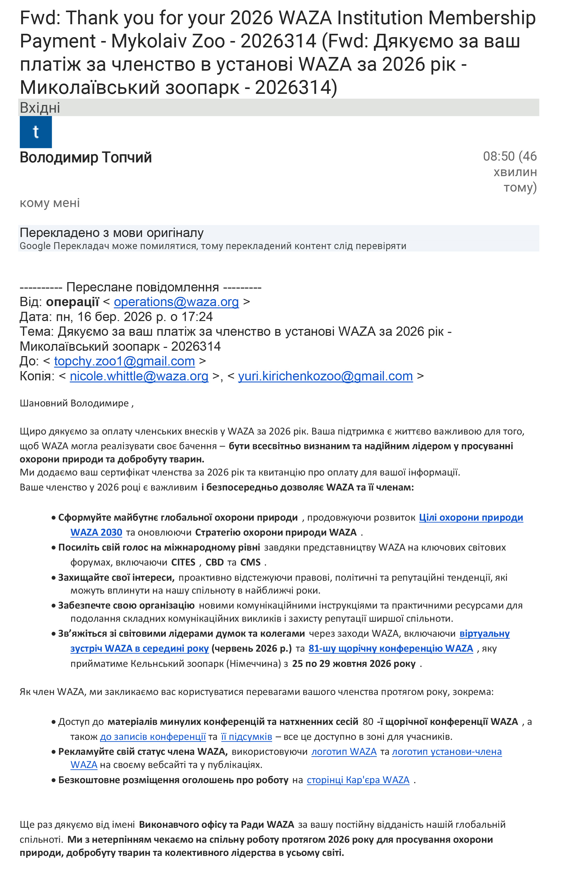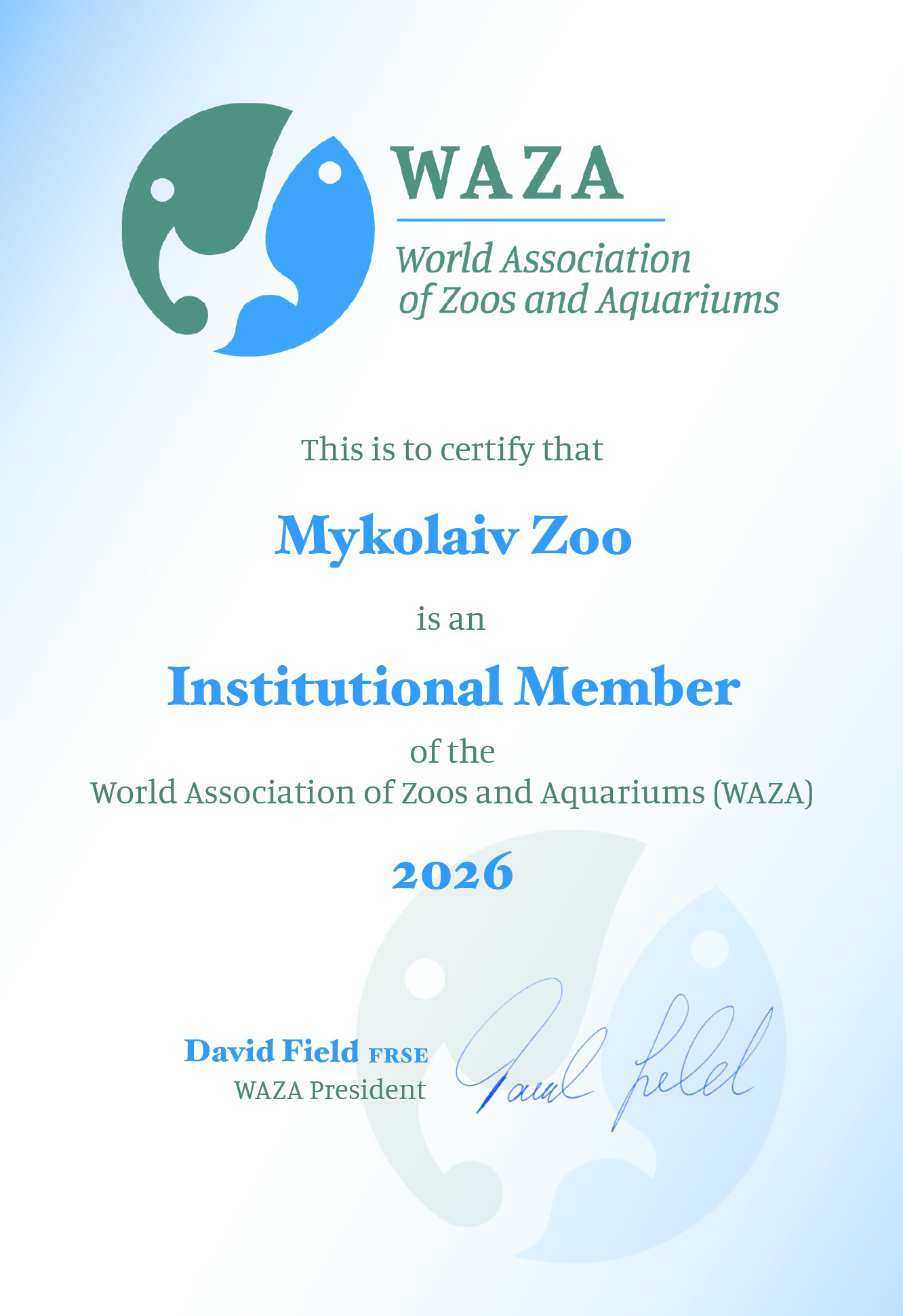 Миколаївський зоопарк - членство в установі WAZA за 2026 рік